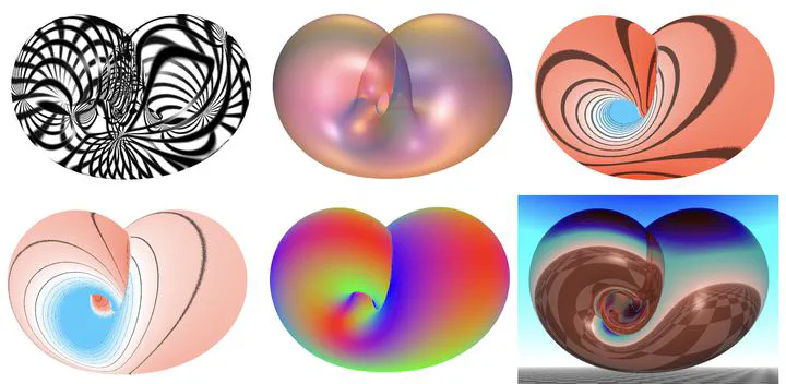 Several views of a Klein surface (often called Klein bottle): principal directions, mean and Gaussian curvature, transparent view, surface view with reflectionsOverview