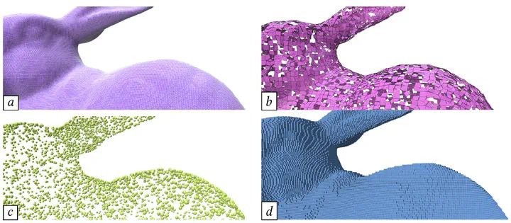 The objective of the project is to propose new calculus models for the geometry processing of large, heterogeneous and complex geometrical objects. The targeted geometrical models (polygonal meshes, point clouds, surfaces of voxel sets) are usually defective for direct geometry processing: deficient or missing topology, self-intersections, holes, non-manifold parts, perturbations, outliers. Their common characteristic is to be approximations of an underlying smooth object and not an interpolation of its boundary. Our approach is to build stable geometric proxies (embedded in a regular lattice) for these various data, for two main goals: first to guarantee that the estimates or the results of the calculus are theoretically accurate or stable (when compared to their counterpart from the continuous analysis), second to design practical algorithms that scale well in terms of performance, numerical stability, capability to represent various dimensional objects (volumes, surfaces, 1d curves in space), and memory efficiency (thanks to a multiscale approach). This unified approach provides generic tools to measure quantities and perform calculus on such discrete data, and allows modeling and simulation of complex and natural phenomena on various real geometric data. We will more specifically explore applications in material engineering (analysis and calculus on high resolution volumetric surfaces from micro-tomographic images, fracture simulation on materials…), the geometry processing of acquired massive, highly detailed, 3D point clouds (e.g, billions of points acquired with LiDAR or photogrammetry).