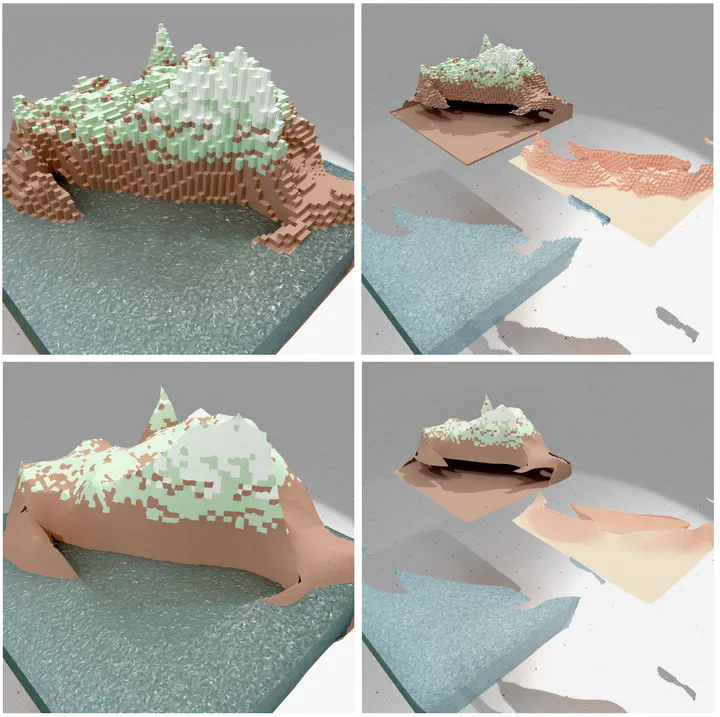 Voxel based modeling is an attractive way to represent complex multi-material objects. Multi-labeled voxel models are also ubiquitous in material sciences, medical imaging or numerical simulations. We present here a variational method to regularize interfaces in multi-labeled digital images. It builds piecewise smooth quadrangulated surfaces efficiently, with theoretical guarantees of stability. Complex topological events when several materials are considered are handled naturally. We show its usefulness for digital surface approximation, for voxel art regularization by transferring colorimetric information, and for upscaling voxel models to speed up coarse-to-fine modeling.
