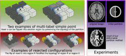 The main contribution of this paper is the definition of multi-label simple points ensuring that the partition topology remains invariant during a deformation process. The definition is based on intervoxel properties, and uses the notion of collapse on cubical complexes. This work is an extension of a restricted definition that prohibits the move of intersections of boundary surfaces. A deformation process is carried out with a greedy energy minimization algorithm. A discrete area estimator is used to approach at best standard regularizers classically used in continuous energy minimizing methods. The effectiveness of our approach is illustrated by the deformation of topologically correct initial partitions of a 3D medical image to minimize its energy.
