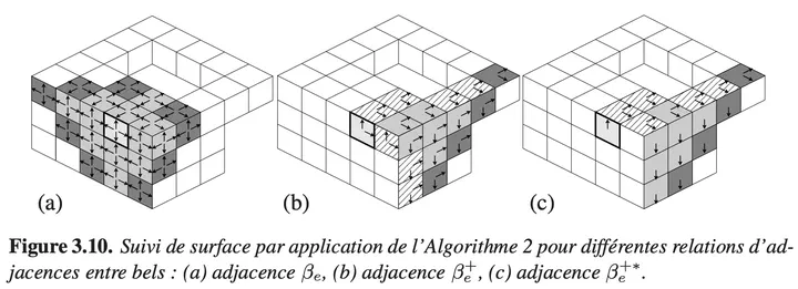 D’autres notions fondamentales en topologie sont les frontières et les surfaces. Par exemple, la frontière d’un objet connexe sans cavité est connexe. Une telle frontière doit satisfaire la propriété de séparation de Jordan. En topologie digitale, on se donne les outils pour définir des frontières et surfaces discrètes qui ont une bonne propriété de séparation. Ces frontières sont ensuite munies de structures de graphes, qui permettent de les construire et de les parcourir efficacement. Des outils existent ensuite pour estimer la géométrie de ces objets ou pour en fabriquer des modèles géométriques.