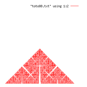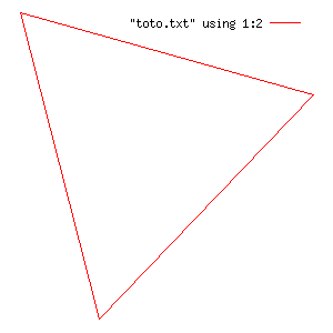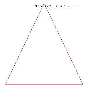 Si on met les coordonnées affichées dans un fichier toto.txt et qu'on les affiche avec gnuplot, nous obtenons bien le triangle équilatéral (à gauche ci-dessous). A l'endroit marqué par (*), rajoutez l'appel tourneG( &T, 45 ). Relancez votre programme. Gnuplot doit maintenant vous afficher la figure de droite.