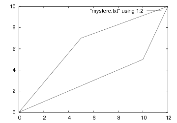 On va plutôt utiliser l'outil gnuplot, qui permet de tracer toutes sortes de diagrammes. On peut notamment lui demander de tracer une ligne polygonale à partir d'un fichier contenant ligne par ligne les deux coordonnées de chaque point. Par exemple, si le fichier mystere.txt contient :
