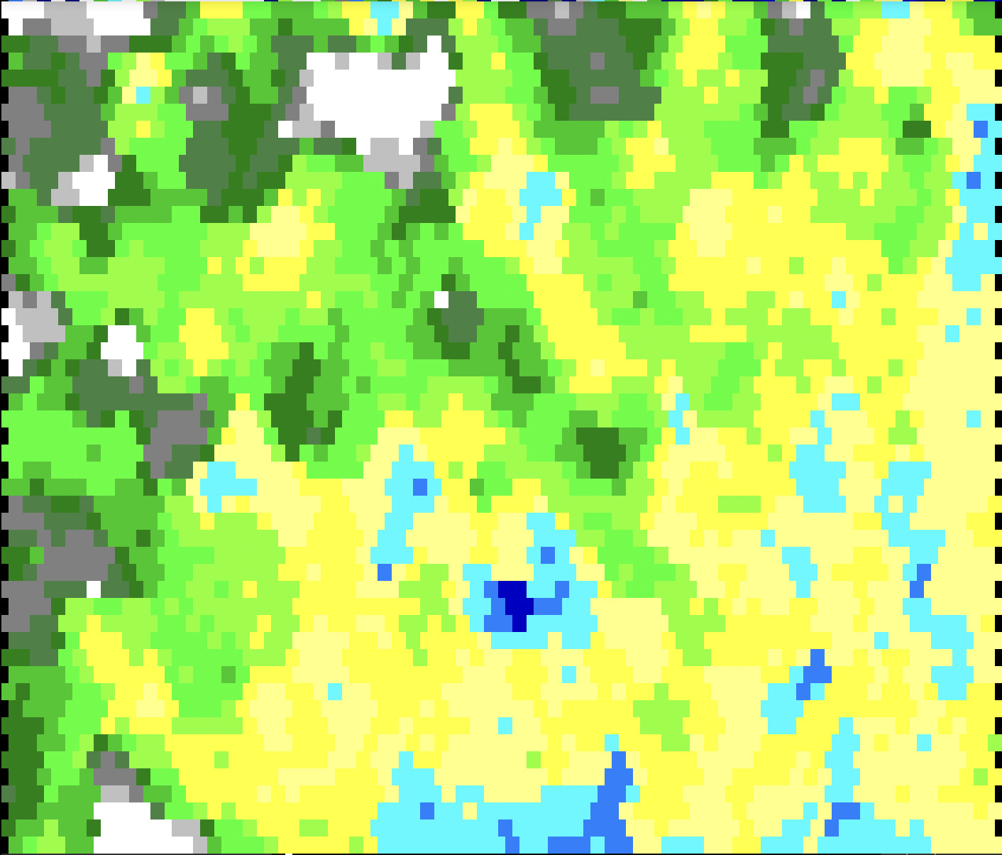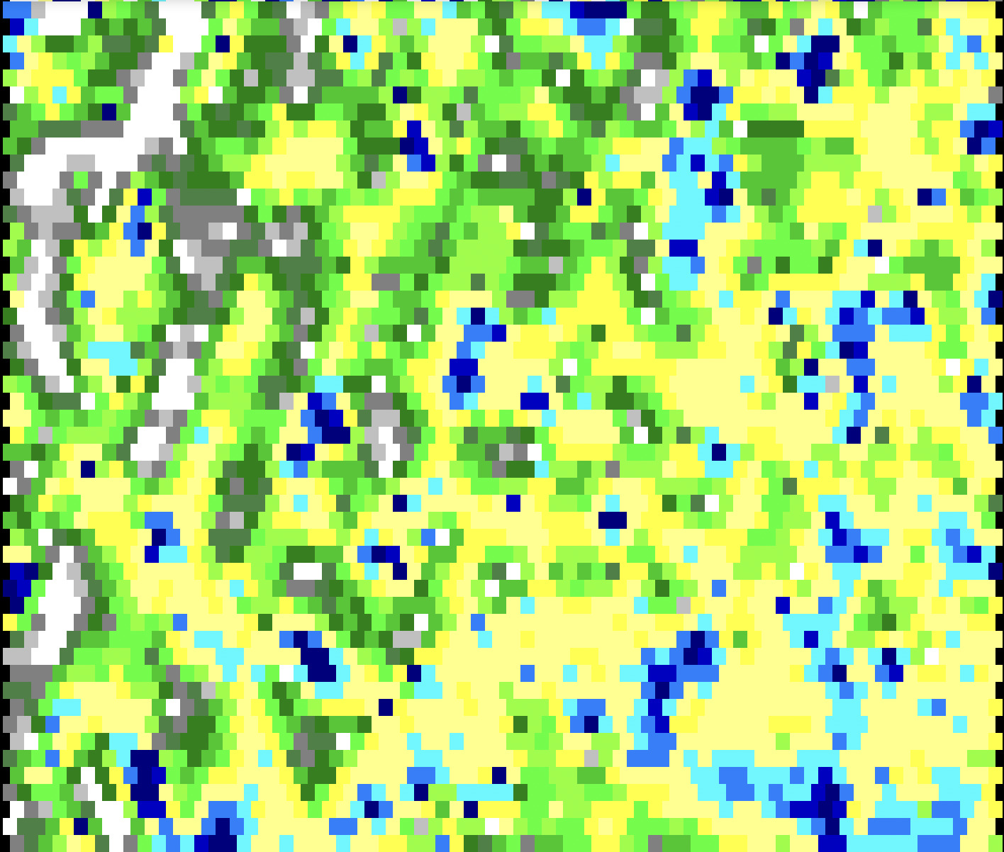 Malheureusement le terrain obtenu est beaucoup trop accidenté pour être réaliste. Il faut le transformer avec des fonctions qui agissent sur une case et son voisinage.