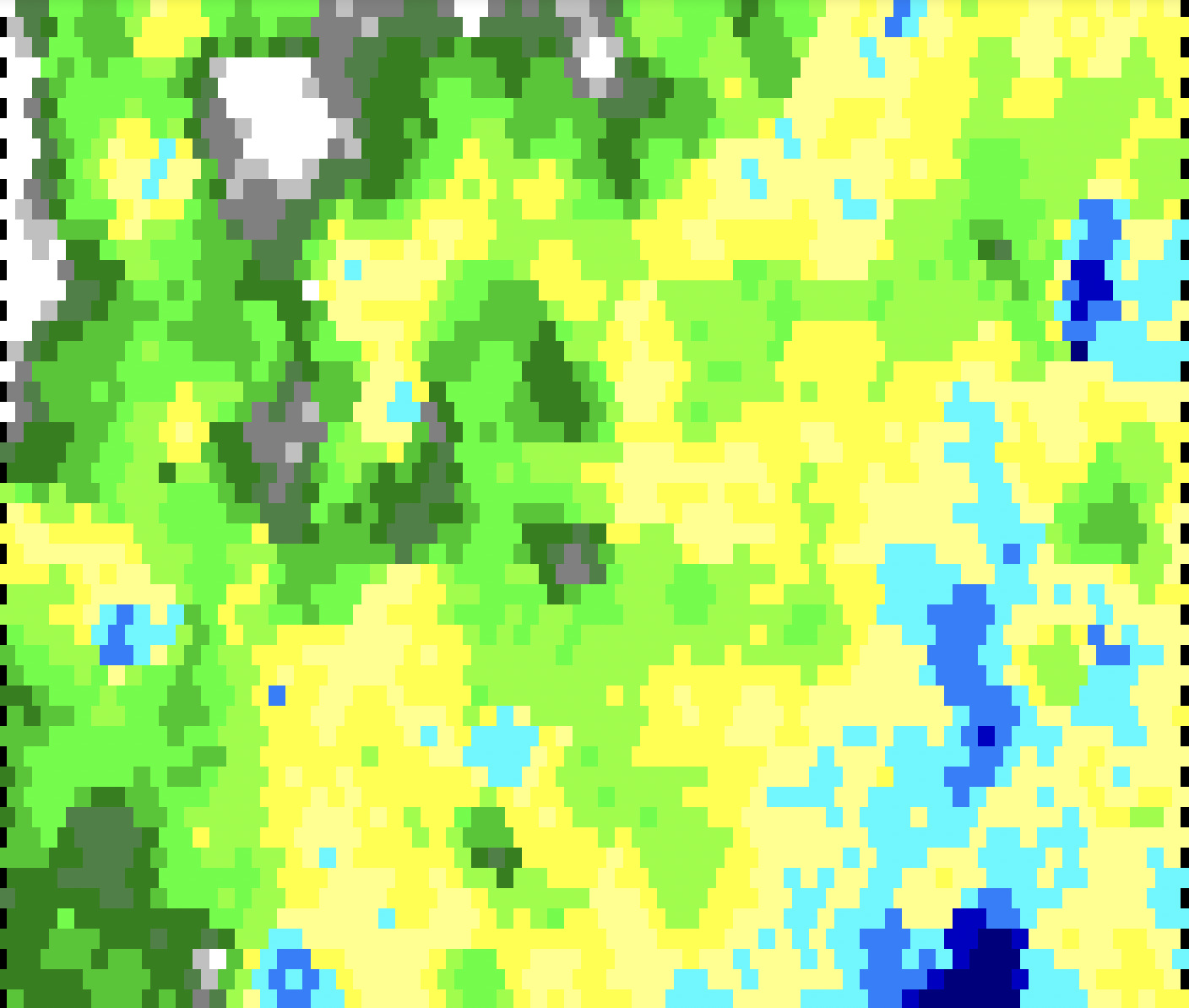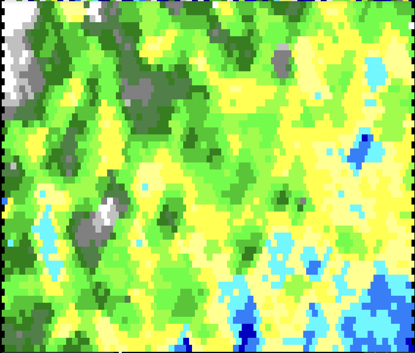 Ensuite on peut initialiser la grille avec des altitudes aléatoires. La fonction ci-dessous fait que le coin haut gauche est plus haut que le coin bas droit (ça fera de la montagne et de la mer ensuite).