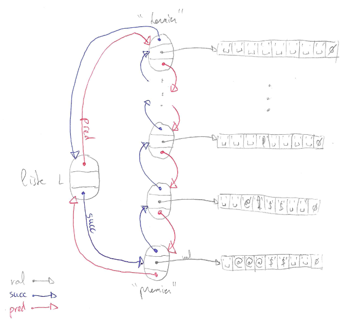 valgrind de la manière suivante :Lorsque vos listes fonctionnent correctement, vous pouvez les adapter afin de les utiliser pour représenter efficacement la grille de jeu de votre Tetris. Chaque noeud de votre liste représentera une ligne du jeu tetris, la première ligne (celle du bas) étant la première cellule utile de votre liste chaînée. Supprimer une ligne se fera donc en supprimant la cellule correspondante et vous devrez rajouter une ligne composée d'espaces en fin de liste. Voilà à quoi ressemble votre liste pour représenter le tetris ci-contre.