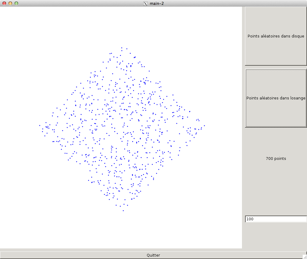 int atoi( char * ) dans stdlib.h. Pour faire l'inverse, on peut utiliser sprintf qui affiche dans un tableau de caractères.Ajoutez un bouton pour générer des points dans le losange de sommets \( \pm (1,0), \pm (0,1) \). L'idée est de tourner les points générés dans le carré \( [-1:1] \times [-1:1] \) de 45 degrés, en divisant les longueurs pour obtenir un côté de taille \(\frac{\sqrt{2}}{2}\). Si x et y sont les coordonnées du point tiré aléatoirement dans le carré précédent, alors la transformation s'écrit ainsi
