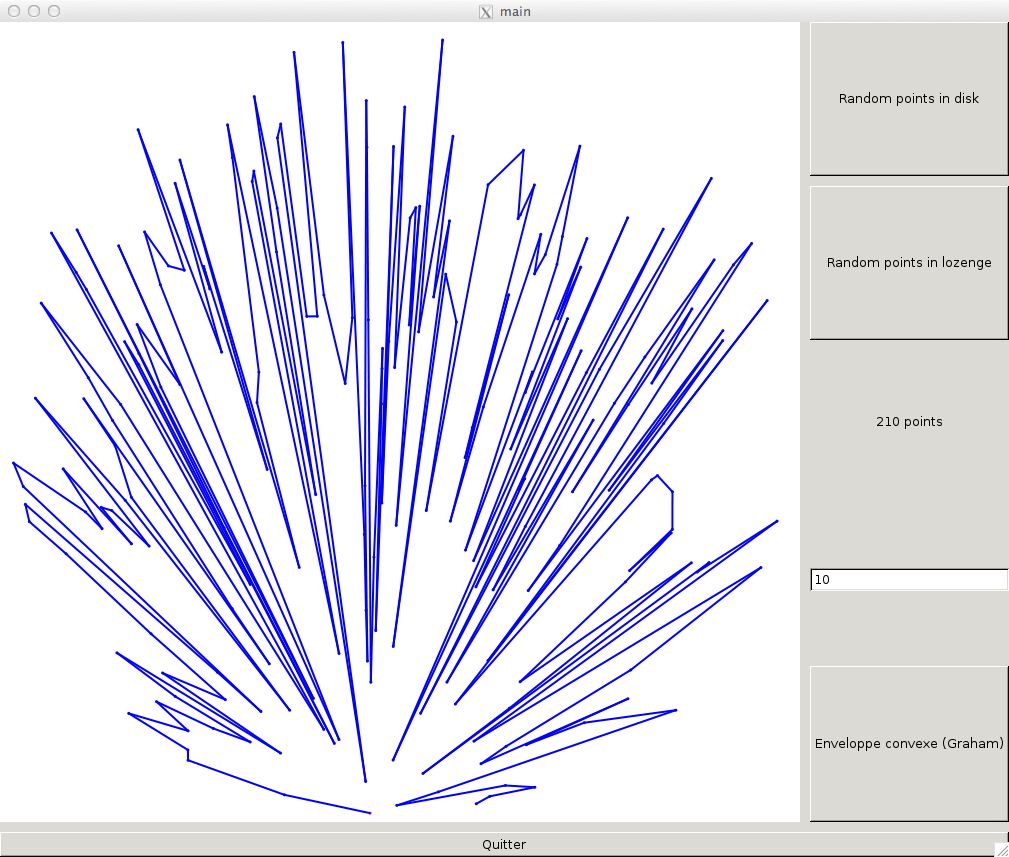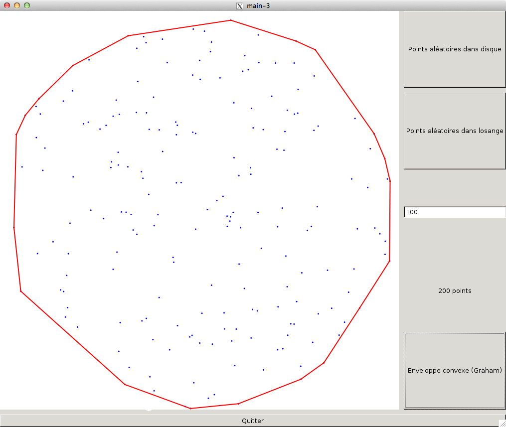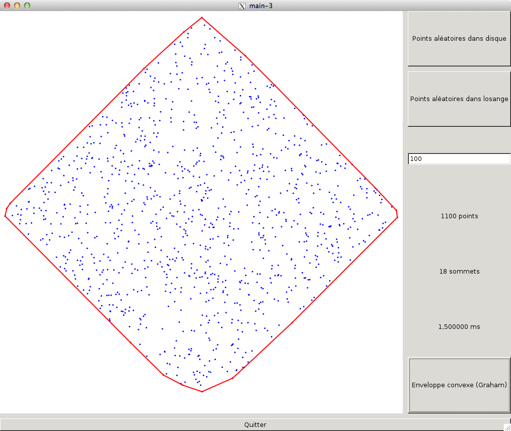 En utilisant des GTK_LABEL, affichez maintenant le nombre de points sur l'enveloppe convexe ainsi que le temps d'exécution du dernier calcul de l'enveloppe convexe. On voit ainsi que sur les formes polygonales, l'enveloppe convexe a très peu de sommets.