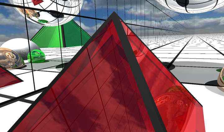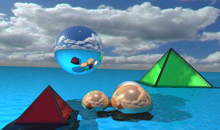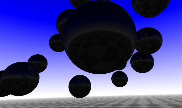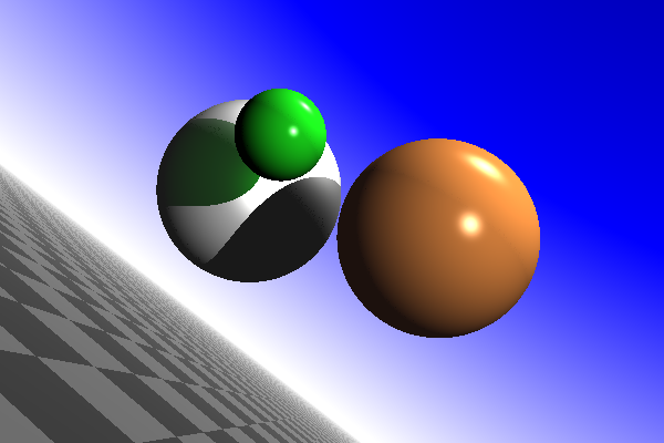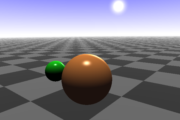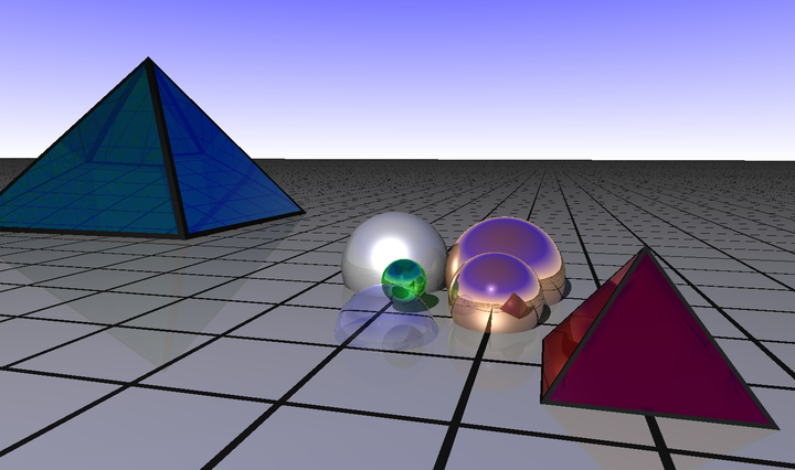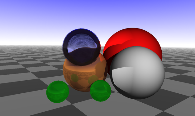 Pour le moment, on n'a pas grand chose de mieux que ce que le simple rendu OpenGL peut donner. Par exemple, on n'a pas les ombres portées, la réflexion ou la réfraction, ni le fond. On commence par le plus simple, un fond moins triste.