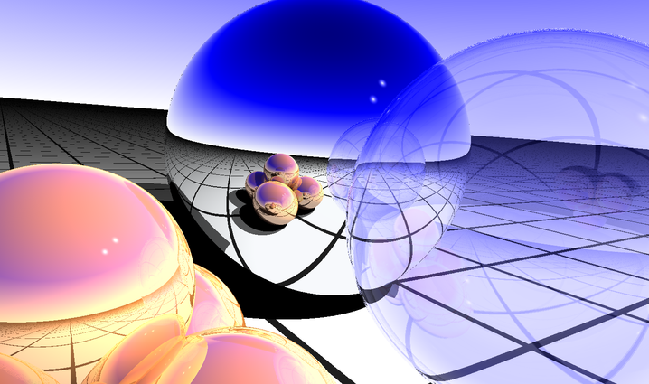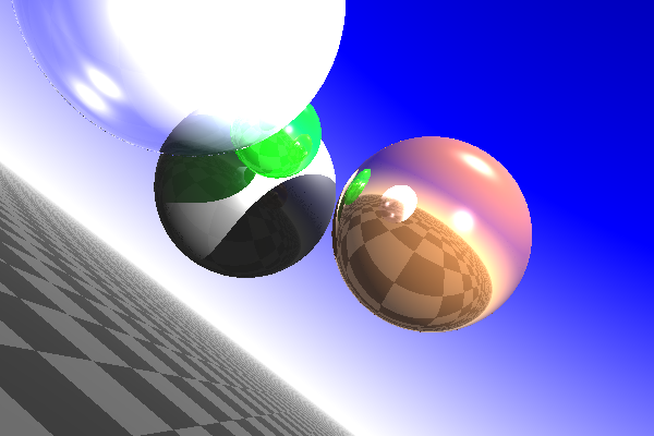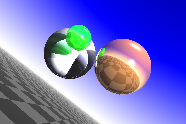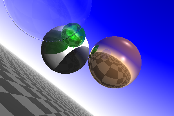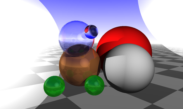 Il ne suffit plus alors qu'à faire la même chose que pour la réflexion, en appelant récursivement Renderer::trace avec le rayon réfracté et en sommant la couleur résultante en tenant compte du coefficient de réfraction et de la couleur diffuse.
