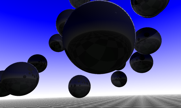Pour faire un dégradé pour le ciel, il suffit de regarder seulement la composante z de la direction du rayon ray. Par exemple, si z est entre 0 et 0.5, on retourne une couleur entre blanc (Color(1,1,1)) et bleu (Color(0.0,0.0,1.0)), puis si z est entre 0.5 et 1.0, on retourne une couleur entre bleu (Color(0.0,0.0,1.0)) et noir ((Color(0.0,0.0,0.0)). On rappelle que l'on peut mélanger des couleurs avec des multiplications, par exemple:
