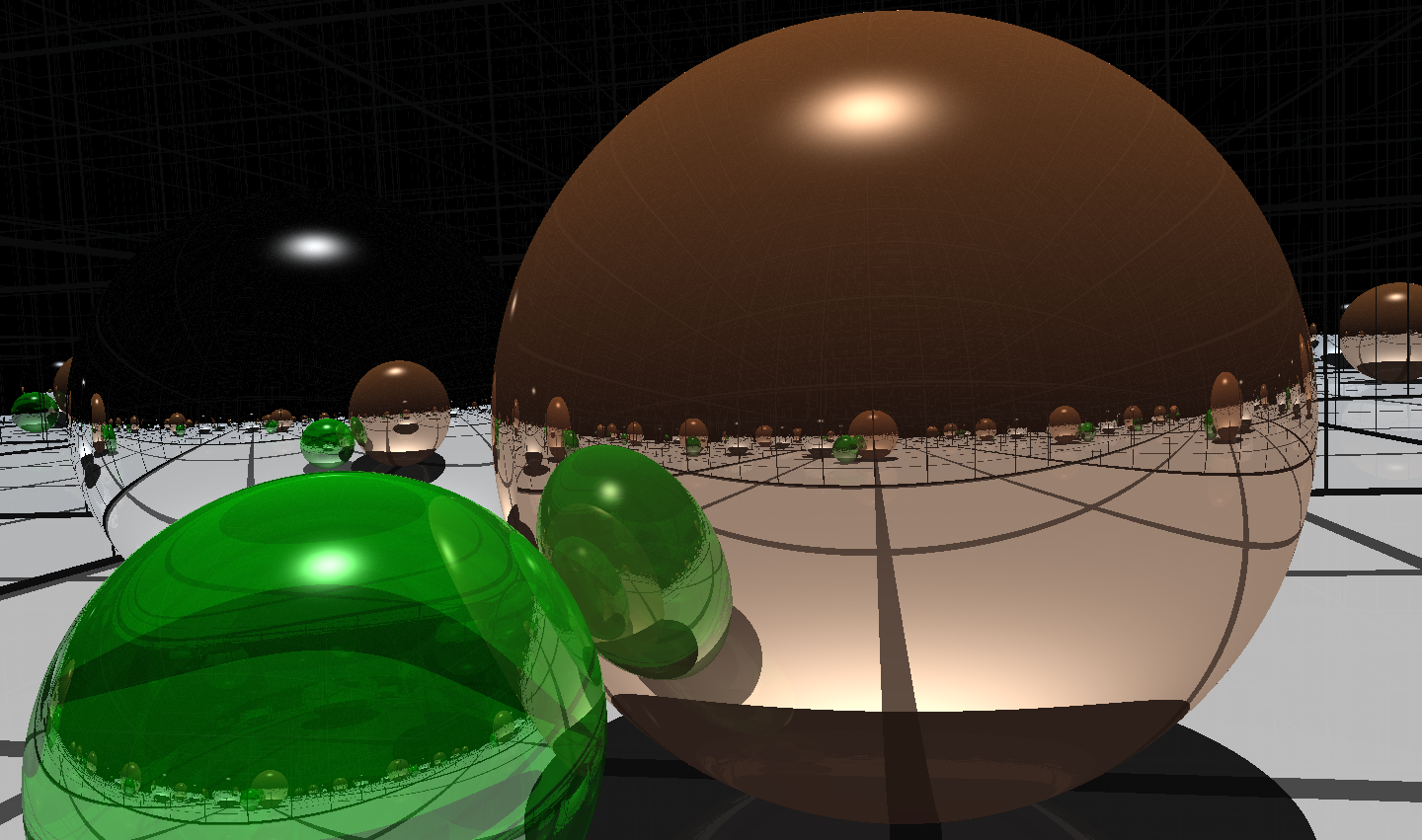 On va simplifier beaucoup tout ça en ne calculant au maximum qu'un rayon réfléchi (et dans la question suivante un rayon réfracté). De plus, on ne va réfléchir le rayon qu'un nombre fini de fois (la fameuse profondeur maximale ou max_depth donnée à Renderer::render).